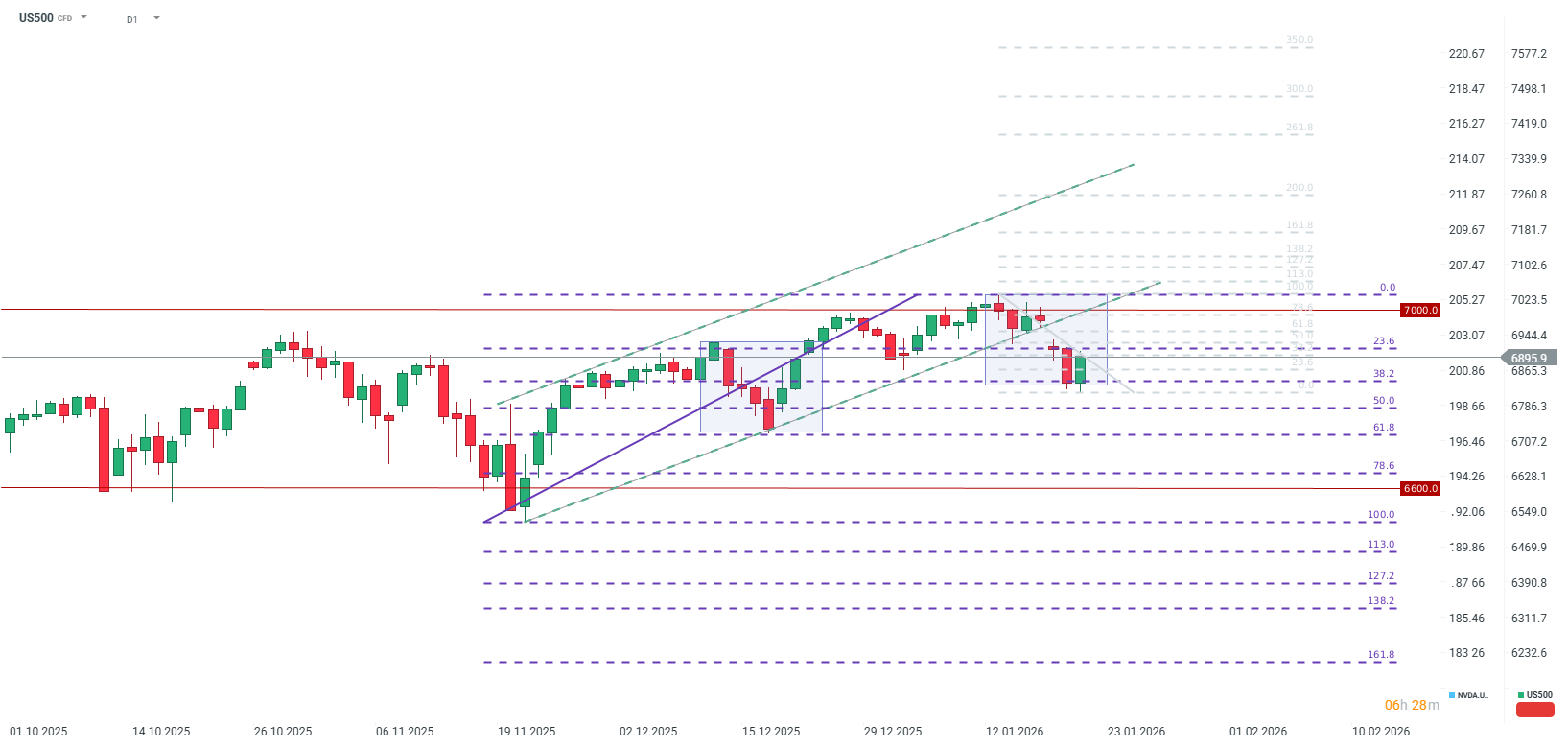 Z technického pohledu index US500 aktuálně testuje úroveň 6 900. Rozhodné proražení nad 23,6% Fibonacciho retracement poslední hlavní impulsivní vlny by posílilo argument pro obnovení primárního býčího trendu a potvrdilo, že aktuální pokles zůstává v rámci běžné korekce.