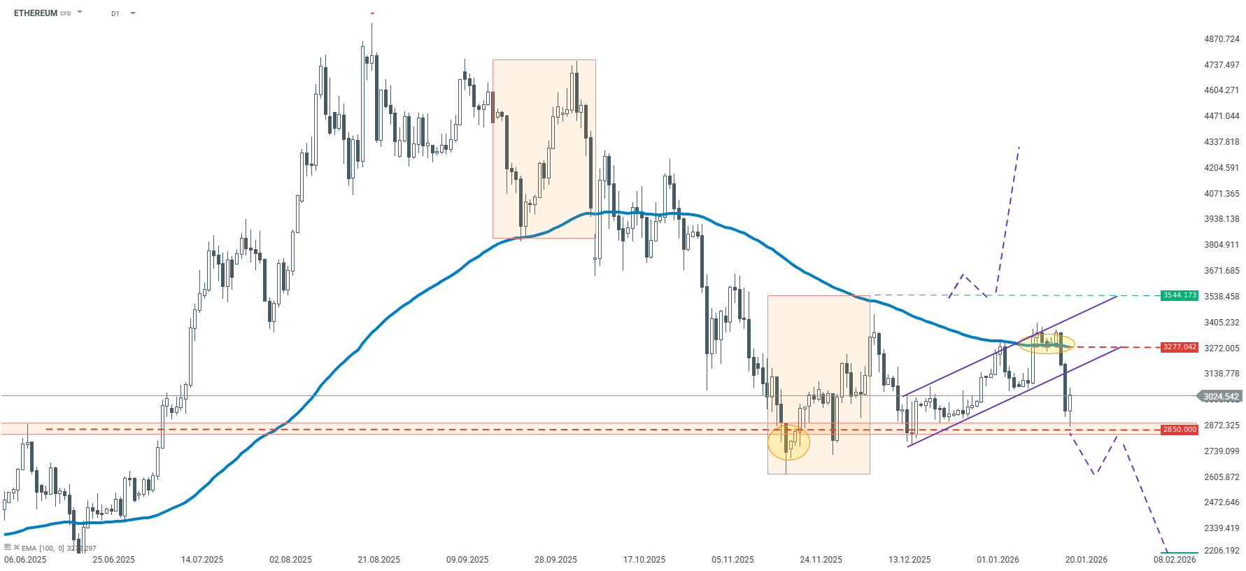 Ceny Etherea se již několik měsíců nacházejí v downtrendu, což potvrzuje jak cenová struktura, tak sklon 100periodického klouzavého průměru. Poslední pokles vedl k výrazné korekci směrem vzhůru, která byla zastavena v oblasti průměru EMA100. Cena tento průměr mírně překonala, ale následovala silná prodejní reakce, která potvrdila, že tato úroveň v současnosti funguje jako významná rezistence.
