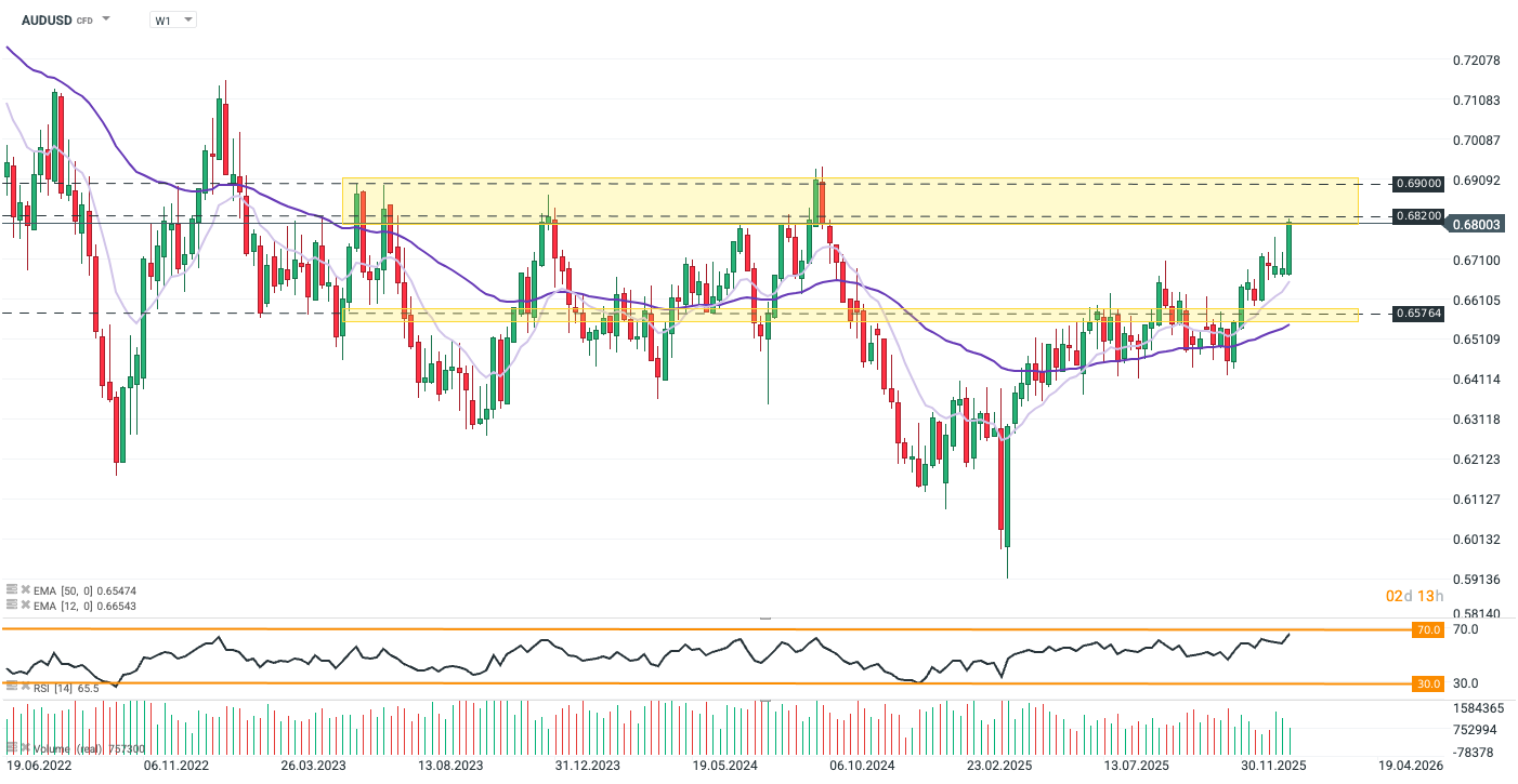 AUDUSD se obchoduje na nejvyšší úrovni od konce září až října 2025. Po týdnu stagnace se vrátila volatilita a cena odrazila od 12týdenního exponenciálního klouzavého průměru (EMA12, světle fialová), čímž potvrdila dlouhodobý růstový trend. Pár se nyní blíží k zóně 0,68–0,69, která od roku 2023 funguje jako strop. Proražení nad tuto úroveň může nastat, pokud se pracovní trh dále utáhne a inflace zůstane zvýšená. Nicméně dosažení víceletých maxim pravděpodobně povede k větší opatrnosti mezi obchodníky sázejícími na pokračování trendu.
