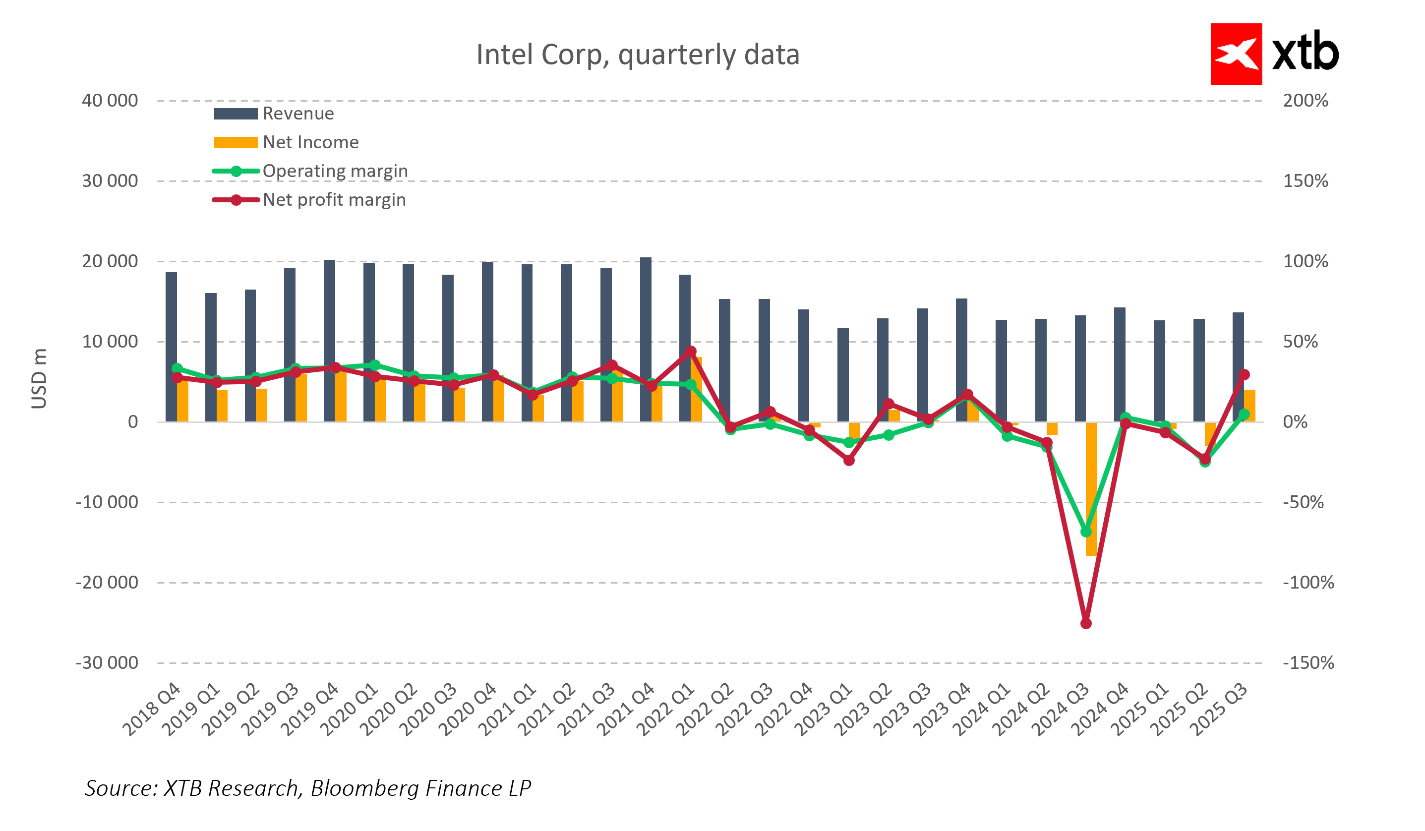 Akcie amerického výrobce polovodičových čipů (INTC.US) dnes po čtvrtletních výsledcích oslabují o téměř 22 %. Společnost hodlá podnik restrukturalizovat a propustí 15 000 zaměstnanců (15 % z přibližně 110 000 míst na plný úvazek), přičemž si ponechá pouze pozice na plný úvazek, které jsou nezbytné pro pokračování provozu. To vše v rámci programu snižování nákladů (10 miliard dolarů v roce 2024). -
