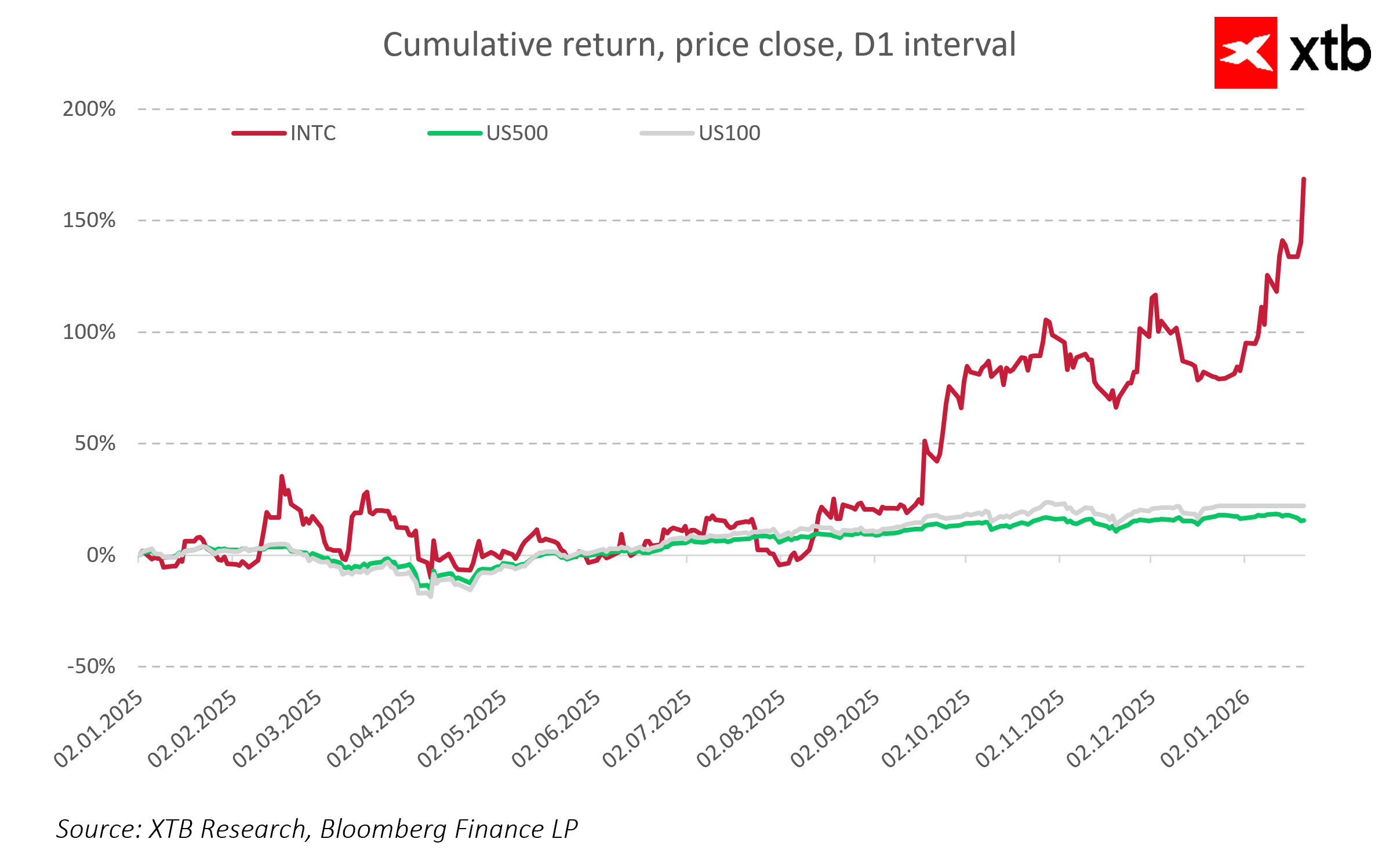 Od začátku loňského roku vzrostly akcie Intelu téměř o 150 %, což odráží rostoucí očekávání trhu spojená s restrukturalizací, investicemi do Foundry a expanzí v AI a Data Center.