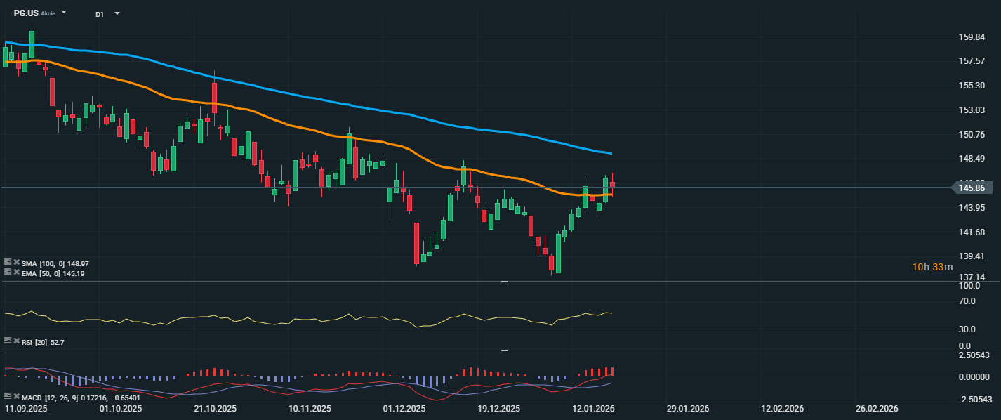 Akcie společnosti Procter & Gamble se aktuálně obchodují na ceně 145,86 USD, čímž testují rezistenci v podobě klouzavého průměru EMA 50 (145,19 USD). Růstový pohyb, který začal v první polovině ledna, dostal akcie zpět nad krátkodobé technické bariéry, ale trend zůstává klesající, jak naznačuje stále sestupující SMA 100 (148,97 USD). RSI se posunul na 52,7 bodu, tedy nad neutrální zónu, což indikuje zlepšující se momentum, ale zároveň nenaznačuje překoupenost. Krátkodobě je rozhodující, zda se akcie udrží nad EMA 50 – případné potvrzení tohoto průrazu by mohlo otevřít cestu k otestování SMA 100 a psychologické úrovně 150 USD. Naopak neúspěšný průraz nad 146–148 USD by mohl vést k opětovnému návratu směrem k 140 USD.