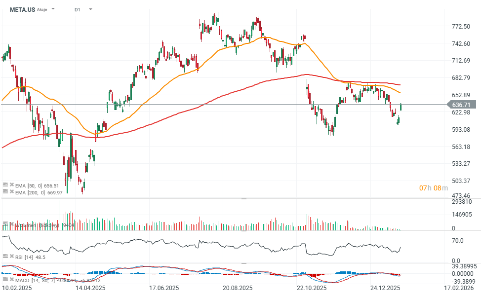 Meta Platforms (META.US) se opět dostává do přízně investorů po téměř 20% korekci – akcie dnes posilují o téměř 4 %. Společnost Jefferies zopakovala své doporučení „Buy“ s odkazem na atraktivní poměr rizika a výnosu po nedávném poklesu. Cílová cena Jefferies zůstává na úrovni 910 USD, což implikuje přibližně 45% růstový potenciál oproti aktuálním úrovním. Akcie Zuckerbergovy firmy se přitom stále obchodují hluboko pod nejvyšším cílem na Wall Street, který činí 1 117 USD.