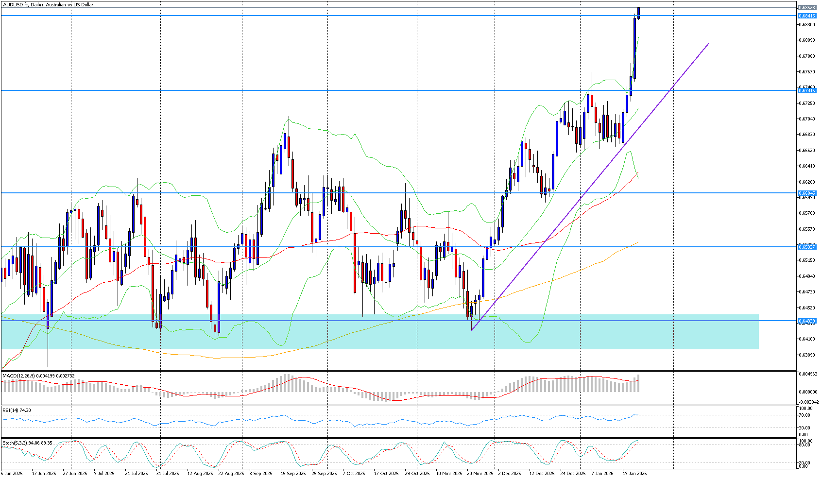 Měnový pár AUD/USD pokračuje ve výrazném růstovém trendu a čtvrtý den v řadě posiluje až k úrovni 0,6850, což představuje nejvyšší hodnotu od října 2024. Tento pohyb potvrzuje sílu aktuálního býčího impulsu, když se kurz nejen dostal nad horní Bollingerovo pásmo kolem 0,6750, ale zároveň se stabilně obchoduje nad krátkodobými, střednědobými i dlouhodobými klouzavými průměry. Tržní struktura tak jasně favorizuje kupce a naznačuje pokračující pozitivní momentum. Za posílením australského dolaru stojí především příznivý fundamentální vývoj. Lepší než očekávaná data o růstu čínské ekonomiky zlepšila sentiment vůči měnám citlivým na globální obchod, zatímco domácí údaje z australského trhu práce přidaly další podporu. Míra nezaměstnanosti v prosinci klesla na 4,1 % z listopadových 4,3 %, což výrazně překonalo tržní konsenzus počítající s hodnotou 4,4 %. Tyto výsledky posílily očekávání odolnosti australské ekonomiky a přispěly k pokračujícímu přílivu kapitálu do měny. Technické indikátory zůstávají jednoznačně prorůstové. MACD se nachází nad signální linií v silně pozitivním teritoriu, RSI se posunul do překoupené oblasti a nadále roste, zatímco ADX překročil hranici 30 a potvrzuje sílu trendu. Tyto signály společně naznačují, že současný růst není pouze krátkodobým výkyvem. V případě pokračování zisků může AUD/USD narazit na významnou rezistenci kolem 0,6900. Její překonání by otevřelo prostor pro posun k psychologické hladině 0,7000, což by znamenalo téměř tříleté maximum. Na opačné straně by případná korekce mohla najít první podporu u 0,6700, kde se sbíhá 20denní SMA s rostoucí trendovou linií. Hlubší oslabení by pak mohlo směřovat do oblasti 0,6590 až 0,6630, kde se nachází 50denní a 100denní klouzavý průměr.