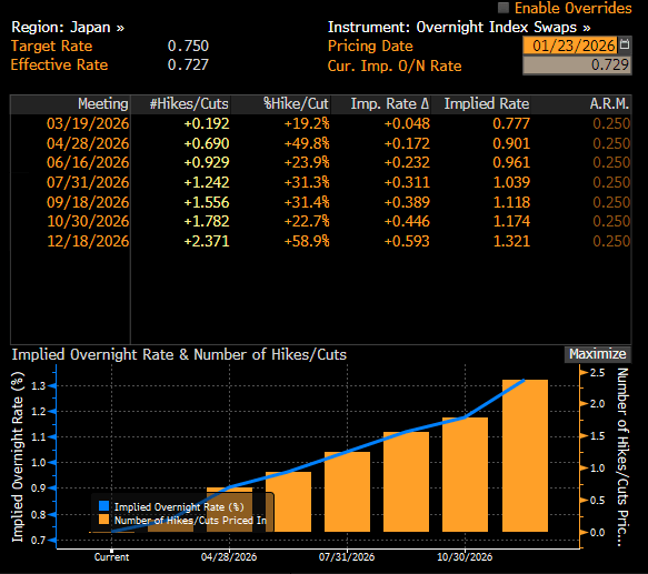 Bank of Japan (BoJ) ponechala krátkodobou úrokovou sazbu beze změny na úrovni 0,75 %. Ačkoliv projekce růstu a inflace centrální banky naznačily výrazně jestřábí postoj, jenu se zatím nepodařilo výrazně posílit. Měna nadále trpí zhoršujícím se fiskálním výhledem, přestože rostou očekávání, že do poloviny roku dojde k obnovení zpřísňování měnové politiky. Trhy aktuálně zohledňují mírně přes dvě zvýšení sazeb v roce 2026, zatímco některé instituce, například Citi, počítají až se třemi zvýšeními.