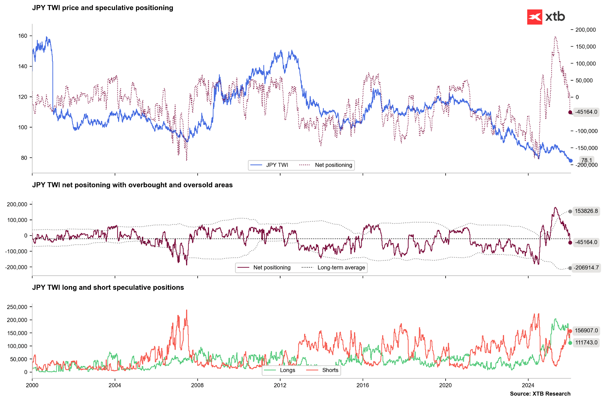 - Střednědobě: Sentiment vůči jenu je extrémně medvědí. Pokud se však naplní růstové projekce a BoJ naznačí konzistentní zpřísňování, je dlouhodobé zotavení pravděpodobné.