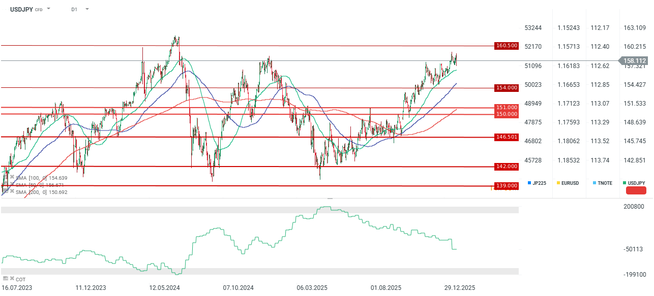 Technický pohled: Růstový moment USD/JPY začíná ztrácet na síle. Ačkoliv opětovný test úrovně 160 zůstává možný, průlom pod 50denní klouzavý průměr by představoval významný signál. Takový pohyb by mohl spustit hlubší korekci směrem k pásmu 150–151, zvláště pokud trh jako celek dále přijme narativ „Sell America.“