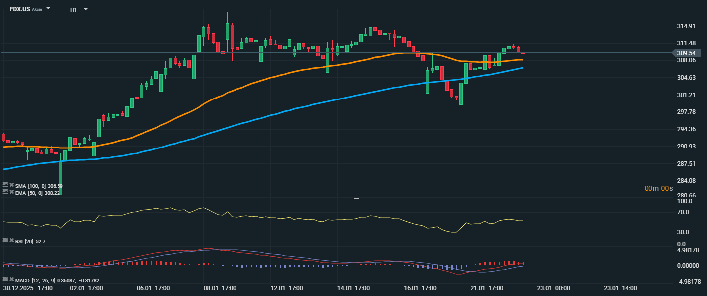 Akcie společnosti FedEx se na hodinovém grafu obchodují kolem úrovně 309,54 USD, přičemž dochází k zajímavému technickému vývoji. Cena prorazila zpět nad klouzavý průměr EMA 50 (308,22 USD) i SMA 100 (306,59 USD), což může značit návrat býčího momenta po předchozí korekci. RSI ukazuje na neutrální zónu, což znamená, že zatím není přítomna ani překoupenost, ani přeprodanost, a trh má prostor pro další pohyb oběma směry.