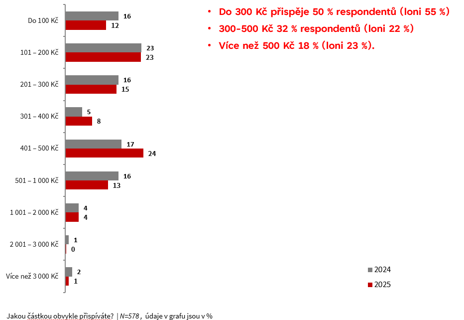 V roce 2025 přispělo částkou 300–500 Kč 32 % dárců, což představuje nárůst o 10 % oproti předchozímu roku. Částku do výše 300 Kč věnovalo celkem 50 % respondentů, což je mírný pokles oproti 55 % v roce 2024. Více než 500 Kč přispělo 18 % dotázaných.