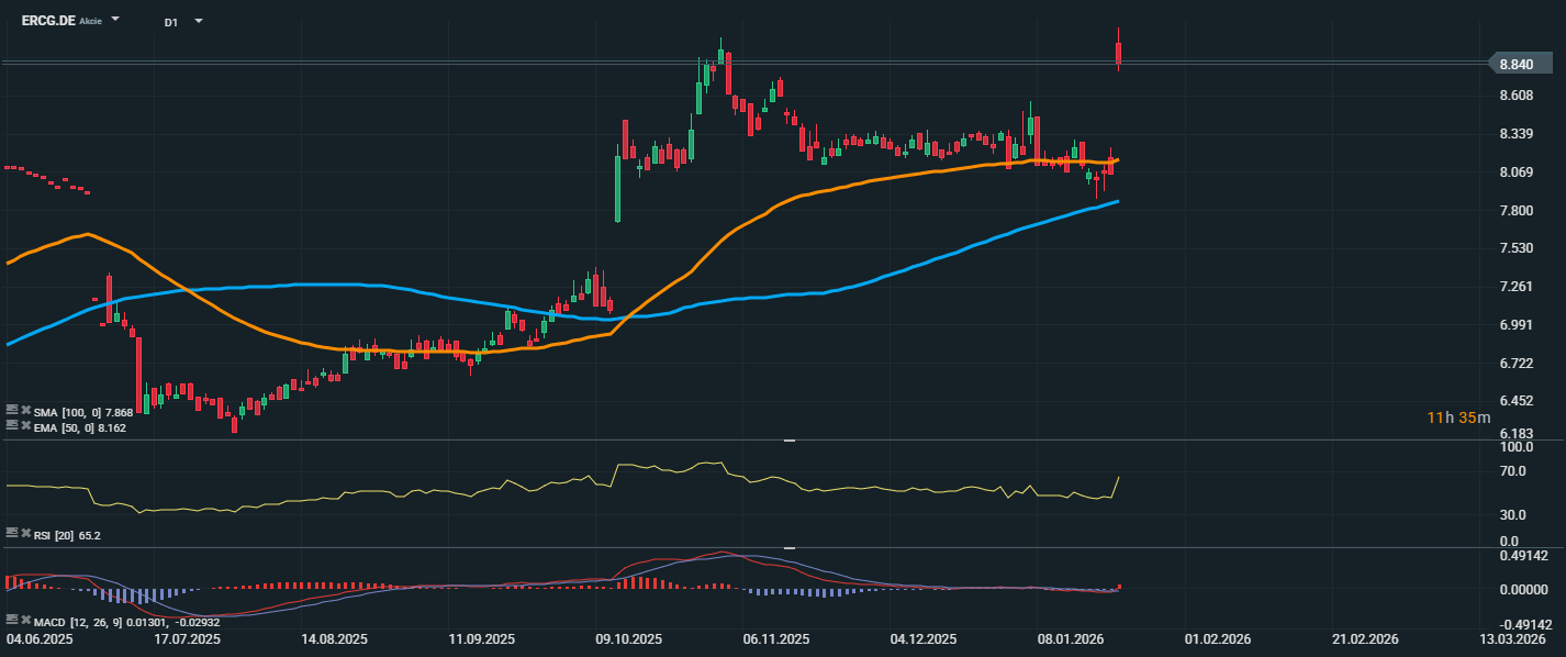 Akcie společnosti Ericsson dnes výrazně posilují a aktuálně se obchodují na úrovni 8,84 EUR, což představuje prudký cenový růst. Technicky vzato došlo k průrazu nad EMA 50 (8,16 EUR) a SMA 100 (7,87 EUR), což potvrzuje býčí nastavení. RSI se vyšplhal na 65,2 bodu, což ukazuje na silné nákupní momentum, ale zároveň se blíží zóně překoupenosti, která začíná na hodnotě 70. Překonání technických rezistencí a dnešní gap vzhůru může přitáhnout další kupce. Nicméně investoři by měli sledovat, zda se cena udrží nad úrovní 8,60 EUR, která může nyní působit jako krátkodobá podpora.