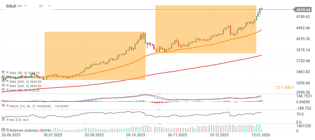 Největším rizikem pro zlato a celý sektor drahých kovů se zdá být možnost, že Jerome Powell zůstane v čele Fedu – což by snížilo pravděpodobnost realizace tzv. „Trumpova modelu“, v rámci kterého by Fed agresivně snižoval sazby a toleroval inflaci poblíž cíle. Ani takový scénář by však nemusel odradit zahraniční centrální banky a velké fondy od snižování expozice vůči Treasuries. Na pozadí rostoucího napětí kolem Grónska se může toto téma stát klíčovým i pro severské země a penzijní fondy v severní Evropě, nikoliv pouze pro státy BRICS.