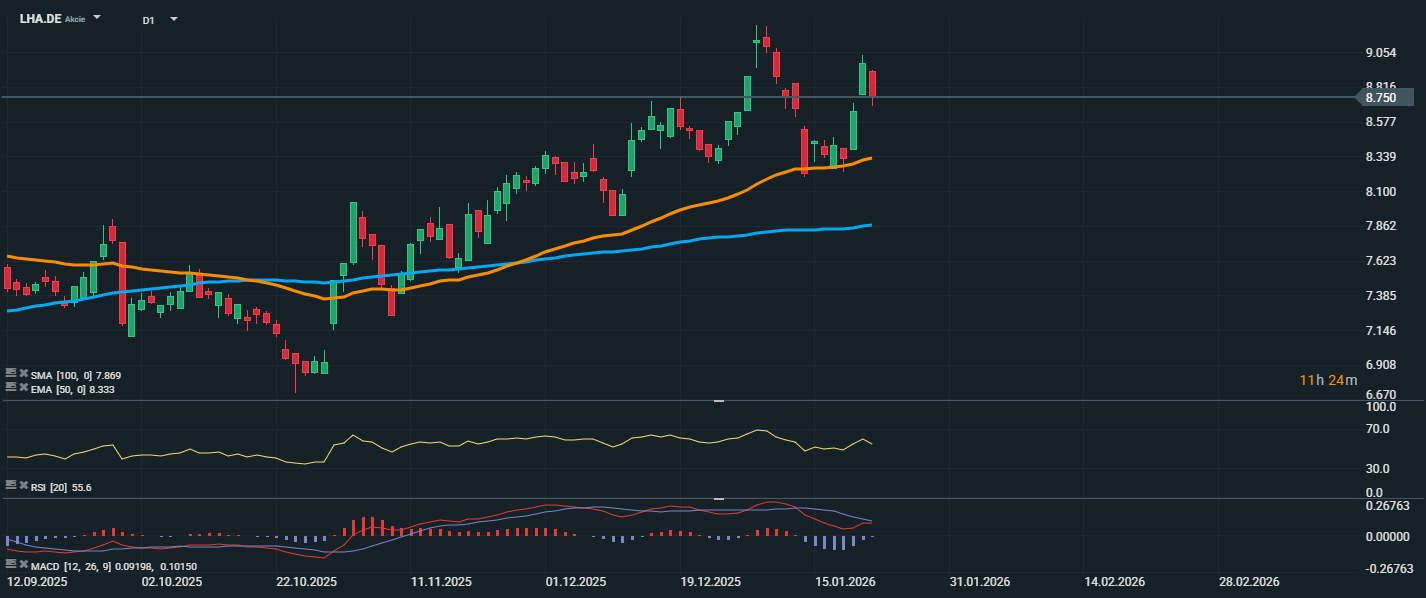 Akcie společnosti Lufthansa se obchodují kolem úrovně 8,75 EUR, přičemž v posledních dnech došlo k výraznému růstu po předchozí korekci. Cena se odrazila od klouzavého průměru EMA 50 (8,33 EUR), který momentálně slouží jako krátkodobá podpora. Dlouhodobější průměr SMA 100 se nachází na 7,87 EUR a ukazuje na stabilní růstový trend od října 2025. RSI se pohybuje na úrovni 55,6, tedy v neutrálním pásmu, což naznačuje, že cena má prostor k dalšímu růstu bez rizika překoupenosti. Z pohledu technické analýzy působí odraz od EMA 50 jako potvrzení zájmu kupců a může být impulzem k otestování lokální rezistence v oblasti 8,90–9,05 EUR. Naopak nejbližší podporu lze hledat právě u EMA 50, případně níže kolem úrovně 8,10 EUR, kde předtím došlo ke konsolidaci.