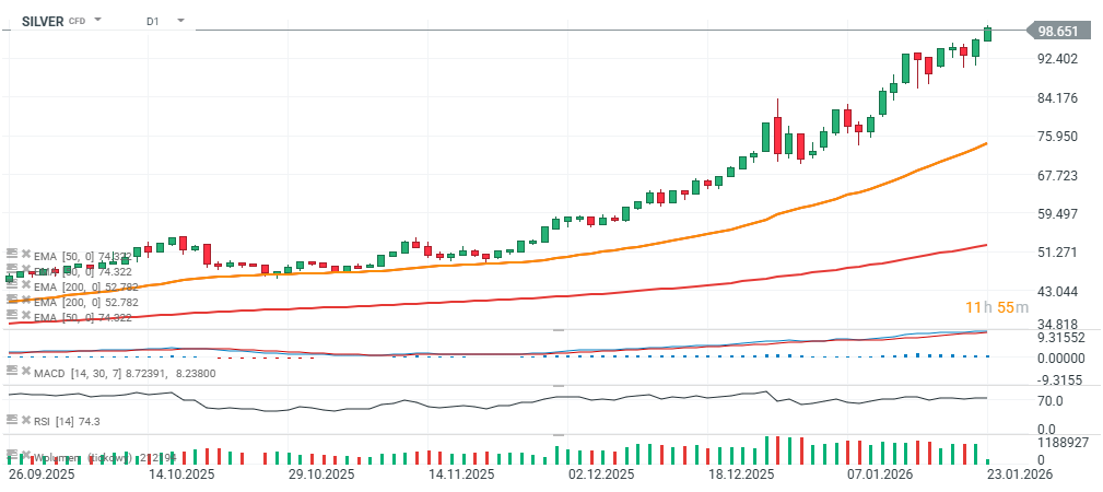 Stříbro včera dosáhlo nového historického maxima, čímž překonalo maxima z počátku 80. let a z roku 2011. Zásadní však je, že se mu nepodařilo uzavřít nad 50 dolary za unci. Zatímco zlato včera zaznamenalo silnější korekci, stříbro začalo páteční ráno silnými zisky. Tyto nárůsty se zrychlily na více než 3,5 % a kov se nyní obchoduje kolem 50,90 USD za unci, což vytváří předpoklady pro potenciálně rekordní závěrečnou cenu. -