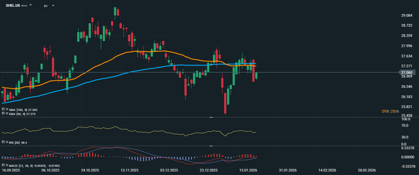 Akcie společnosti Shell se aktuálně obchodují na ceně 27,06 GBP, tedy těsně pod klouzavými průměry – EMA 50 (27,28 GBP) a SMA 100 (27,37 GBP). Tato oblast působí jako krátkodobá rezistence, kterou cena opakovaně testuje, ale zatím se jí nedaří ji trvale překonat. RSI na hodnotě 48,4 se drží v neutrální zóně, což signalizuje nízké momentum a absenci extrémního přeprodaného či překoupeného stavu. Z grafu je patrné, že kolem úrovně 27,30 GBP je silná technická bariéra, která odděluje případný návrat k růstovému trendu od pokračující stagnace či korekce. Naopak krátkodobou podporu lze sledovat v oblasti 26,55–26,70 GBP – při jejím prolomení by mohlo dojít k dalšímu poklesu.