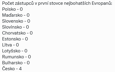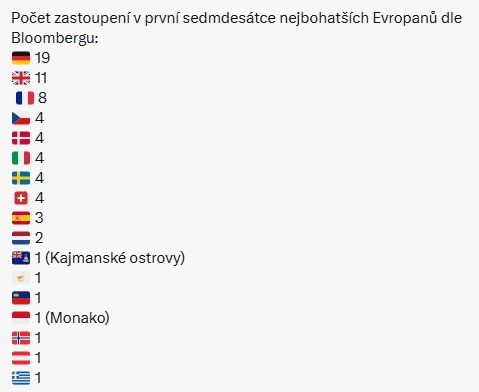 Ze zemí bývalého východního bloku, které jsou nyní členy EU, představuje Česko jedinou zemi, která má v první sedmdesátce i v první stovce nejbohatších Evropanů své zástupce. Polsko, Slovensko, Maďarsko, Slovinsko, Chorvatsko, Rumunsko, Bulharsko, Estonsko, Lotyšsko či Litva nemají v první stovce vesměs nikoho (viz tabulka dle údajů Bloombergu níže). V první sedmdesátce nemají své zástupce Irsko, ani Finsko. V první stovce se pak neumisťuje žádný Portugalec, Belgičan, ani Lucemburčan.
