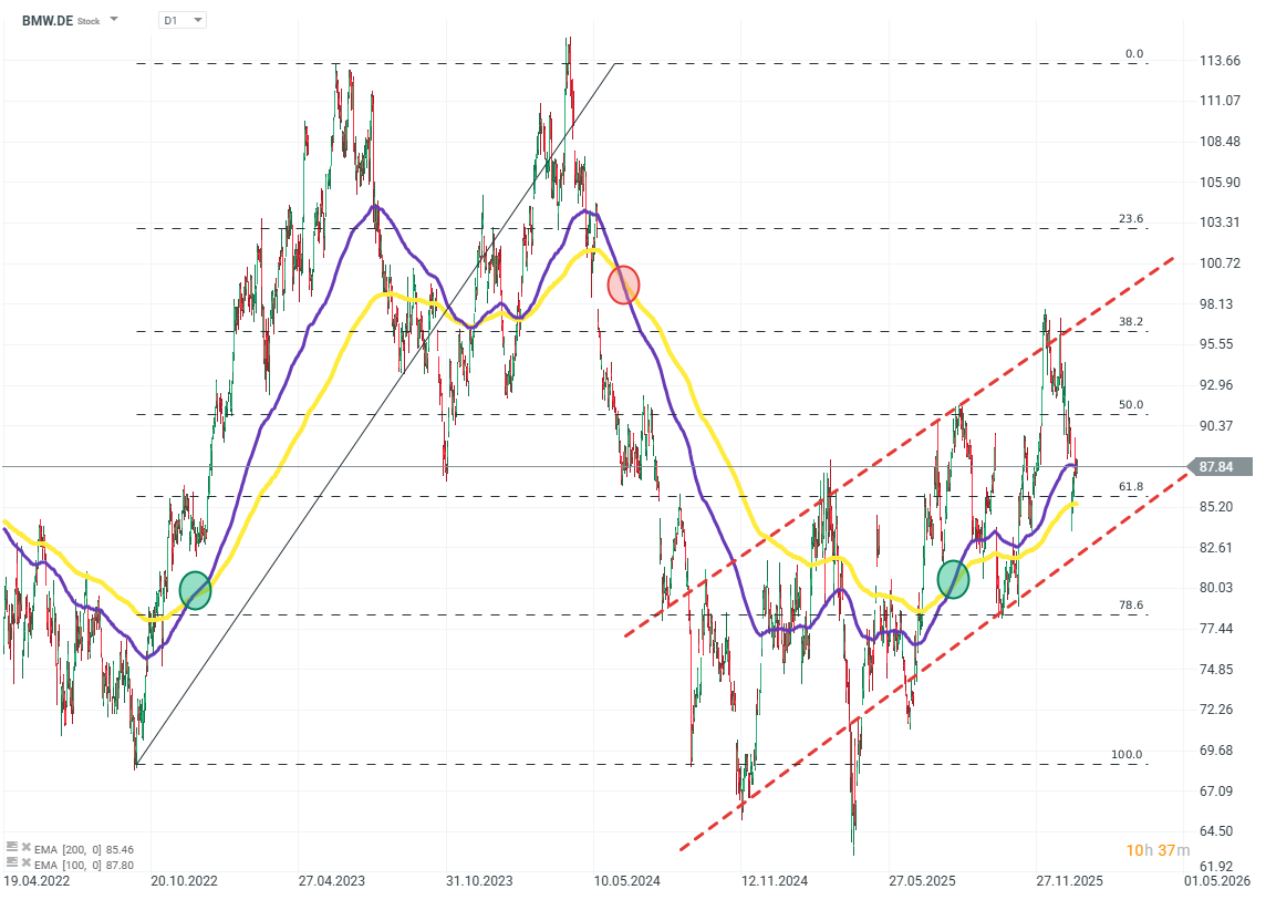 Na grafu lze pozorovat odražení ode dna, protnutí klouzavých průměrů EMA 100 a EMA 200 a návrat do uptrendu.