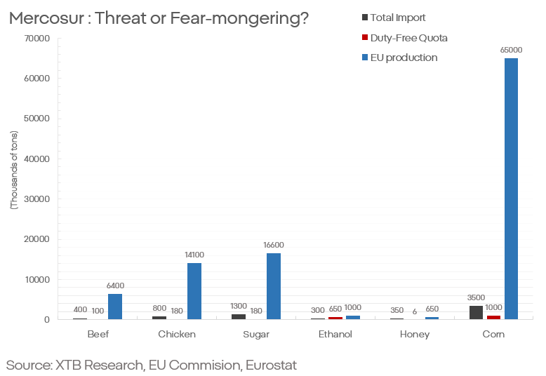 V současnosti činí dovoz hovězího masa do EU přibližně 0,5 milionu tun a drůbežího masa asi 0,3 milionu tun. Evropa sama produkuje přibližně 6–7 milionů tun hovězího a 14 milionů tun drůbežího masa. Plánovaná bezcelní kvóta činí pouze 100–200 tisíc tun.