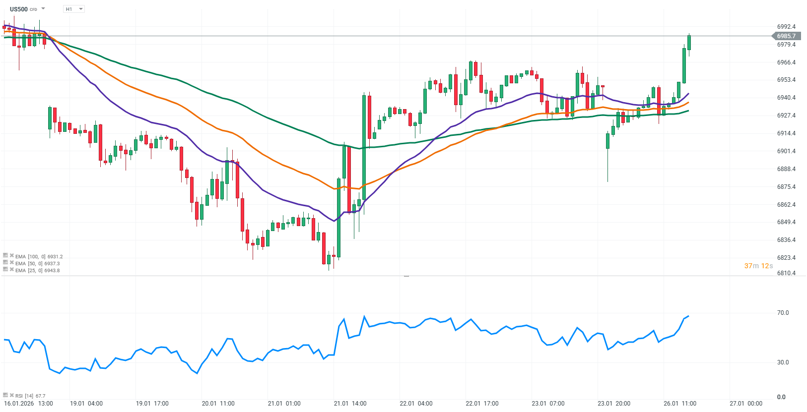 Futures na US500 (S&P 500) během dnešní seance rostou, taženy především optimismem před výsledky skupiny Magnificent 7. Exponenciální klouzavé průměry zároveň formují klasický býčí pattern, což dále podporuje pozitivní náladu na trzích.
