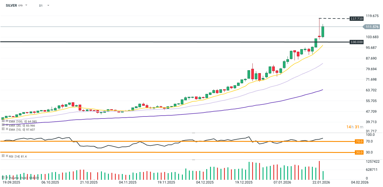 Futures na stříbro opět dynamicky rostou – dalších 6,5 % – a vracejí se nad úroveň 110 USD, navzdory včerejšímu technickému varovnému signálu (inverzní kladivo). Drahé kovy nadále těží z obnoveného obchodního napětí, přičemž bezprecedentní poptávka z Číny dále podporuje rekordní ocenění.