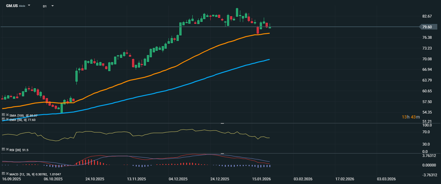 Akcie GM se obchodují na úrovni 79,60 USD a podobně jako Ford se nachází v těsné blízkosti EMA 50 (77,63 USD). Tato úroveň zatím zafungovala jako podpora a zastavila předchozí mírný pokles. SMA 100 (69,97 USD) zůstává vzdálená, což značí silný střednědobý růstový trend. RSI je na hodnotě 51,5, což značí neutrální stav a prostor pro další pohyb oběma směry.