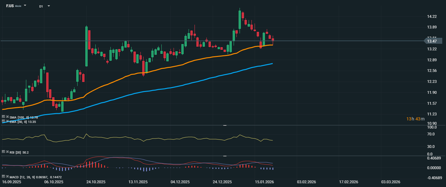 Akcie automobilky Ford se aktuálně obchodují na úrovni 13,47 USD, kde se odrazily od klouzavého průměru EMA 50 (13,35 USD). Tato úroveň zatím slouží jako důležitá technická podpora. SMA 100 (12,78 USD) poskytuje další oporu v případě hlubší korekce. RSI se nachází na 50,2 bodech, což ukazuje na rovnováhu mezi nákupním a prodejním tlakem. Krátkodobě je klíčové sledovat, zda se cena udrží nad EMA 50 – prolomení by mohlo vést k poklesu k úrovni SMA 100.