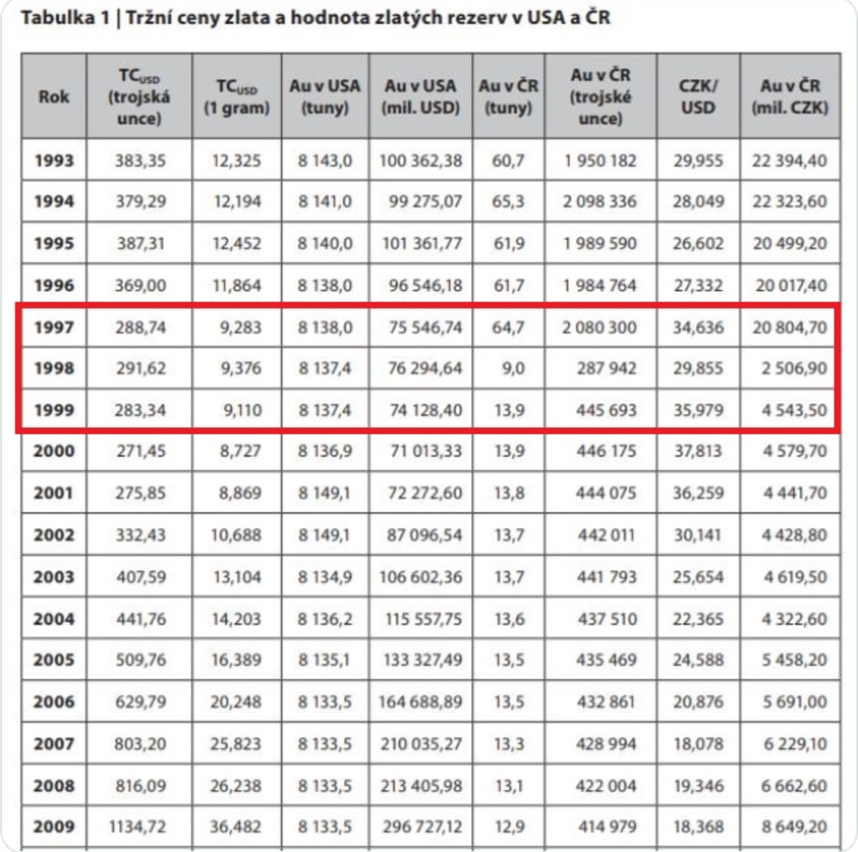 ČNB se tehdy během pár měsíců zbavila zlata střádaného už od dob Rakouska-Uherska, jehož centrální banka při zrodu Československa vytvořila základ jeho zlaté rezervy převedením více než tuctu tun žlutého kovu. Tuto rezervu v téže době rozšířilo zlato ze sbírky na zlatý poklad republiky, což byly dobrovolné příspěvky jejích obyvatel.