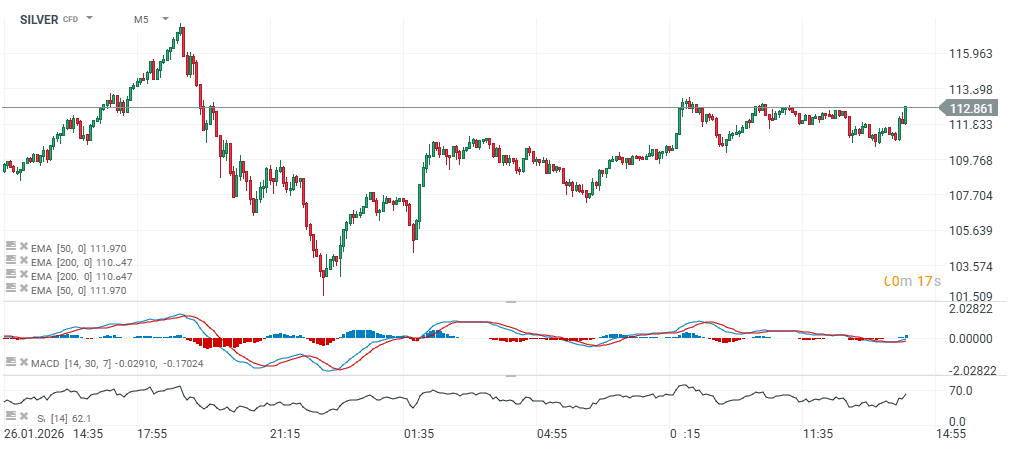 Na krátkodobém 5minutovém grafu indikátory MACD a RSI po ochlazení naznačují prostor pro odraz. Cena se vrací zpět k úrovni 113 USD za unci, kde jsme v uplynulých hodinách pozorovali tři krátké, ale medvědí impulzy.