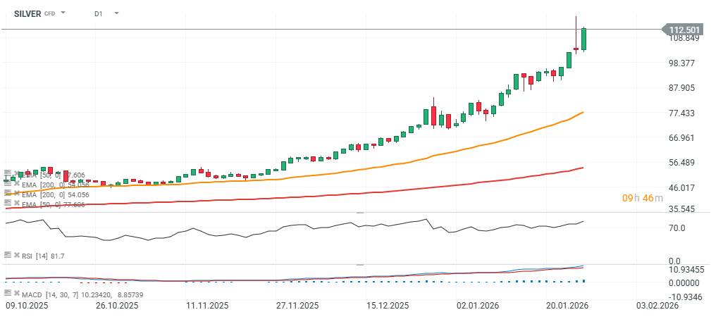 Od rána americký dolar výrazně oslabil, když kontrakt DXY (USDIDX) klesl z přibližně 97 na 96,5. Investoři diskontují scénář trvale holubičí Fedu, a to po spekulacích, že Nick Rieder z BlackRocku by mohl zaujmout vedoucí roli ve Federálním rezervním systému. Trhy zároveň vnímají rostoucí riziko slabší poptávky po amerických dluhopisech, a to v souvislosti s izolacionistickou zahraniční politikou nové administrativy Bílého domu. V kombinaci s napjatými vztahy se spojenci (Evropa a Kanada, která nyní otevřeně signalizuje zlepšení vztahů s Čínou) a stále více dolarově-nepřátelským blokem BRICS dochází k vyšší alokaci do drahých kovů, zejména zlata (směřujícího k 5 090 USD za unci). Stříbro z tohoto pohybu těží nepřímo.