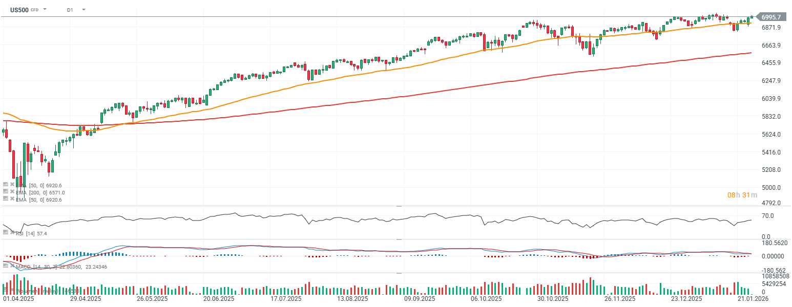 Americký akciový trh na začátku úterní seance přidává, protože investoři postupně zaujímají pozice před zítra očekávaným rozhodnutím Fedu a tiskovou konferencí Jerome Powella. Tato událost pravděpodobně vyvolá určité přeskupení pozic v indexech a na dolarových párech. Na makro úrovni je dnešní klíčovou událostí Conference Board index, který přinese nový pohled na spotřebitelskou důvěru v USA. Ranní data z trhu s bydlením překvapila pozitivně: ceny domů vzrostly o 0,6 % m/m oproti očekávaným 0,3 % a předchozím 0,4 %, zatímco ceny ve 20 největších metropolitních oblastech USA vzrostly o 1,4 % y/y oproti očekávaným 1,2 % a předchozím 1,3 %. Týdenní změna zaměstnanosti podle ADP činila 7,5 tisíce pracovních míst oproti předchozím 8 tisícům. Index US500 se posouvá směrem k úrovni 7 000, která v prosinci vyvolala dvě medvědí impulzy.