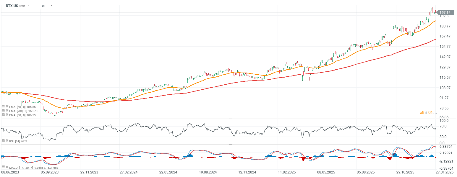 RTX Corp. (RTX.US), největší americký obranný dodavatel a dříve známý jako Raytheon, zveřejnil lepší než očekávané výsledky za 4. čtvrtletí 2025 a potvrdil, že dynamika pokračuje i v roce 2026. Tržby i zisk na akcii překonaly odhady Wall Street, což posiluje širší růstový trend v obranném sektoru. Nejdůležitějším dlouhodobým růstovým katalyzátorem společnosti se zdá být program „Golden Dome“, ačkoli nejistota ohledně jeho realizace, včetně politických třenic s Kanadou a diskusí týkajících se Grónska, může zpozdit jakékoli ocenění související s potenciálním ziskem z tohoto projektu. RTX byla nedávno také jmenována Donaldem Trumpem, který společnost označil za nejméně ochotnou sladit se s novými pokyny Bílého domu. Tyto pokyny zvyšují tlak na obranné dodavatele, aby více investovali do domácích továren a co nejrychleji navýšili výrobní kapacity.