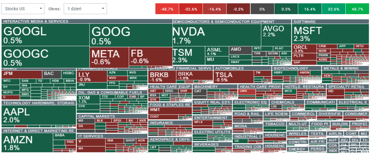 - Síla velkých čipových společností více než kompenzuje viditelnou slabost v segmentu softwaru, kde akcie Oraclu klesají téměř o 4 %. Převažující výkon lídrů mezi velkými společnostmi může také odrážet částečné přeskupování portfolií, protože jména z „Mag 7“ byly v posledních měsících jednou z nejslabších složek hlavních amerických indexů.