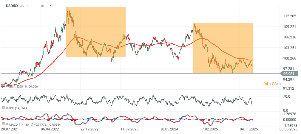 Při pohledu na graf USDIDX, který měří sílu dolaru vůči koši hlavních světových měn, je aktuální pokles téměř zrcadlovým obrazem propadu z let 2022–2023, a to co do rozsahu. Pokud by se tento 1:1 pohyb zopakoval, pak by úroveň kolem 95 byla typickým místem, kde lze očekávat technický odraz. Zatím však mají prodejci pevně navrch. RSI klesl pod 25, což signalizuje extrémně přeprodané podmínky, jaké nebyly vidět celé roky.