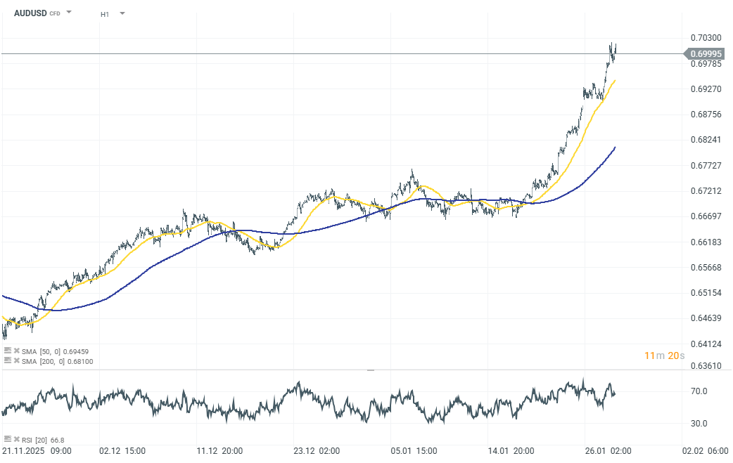 Australský dolar prudce posílil po zveřejnění dat – AUD dosáhl nejvyšší úrovně od začátku roku 2023 a AUDUSD prolomil hladinu 0,70, čímž navázal na silný začátek roku. Investoři se nyní pozicují pro agresivnější RBA ve srovnání s ostatními centrálními bankami. Poslední růst AUDUSD podpořila také široká slabost amerického dolaru.