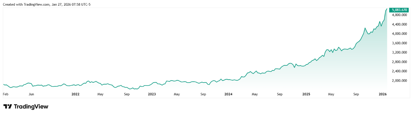 Na globálních finančních trzích jsme svědky bezprecedentního vývoje. Zlato, tradiční uchovatel hodnoty, v posledních dnech definitivně překonalo psychologickou i technickou hranici 5 000 USD za trojskou unci. Během obchodování dosáhla cena úrovně přibližně 5 100 USD, čímž potvrdila přetrvávající dynamiku růstu, která trvá už šest po sobě jdoucích dní. Klíčové je, že tento pohyb neznamená pouze krátkodobý výkyv ceny, ale důsledek dlouhodobého trendu, během kterého se hodnota kovu za poslední dva roky více než zdvojnásobila.