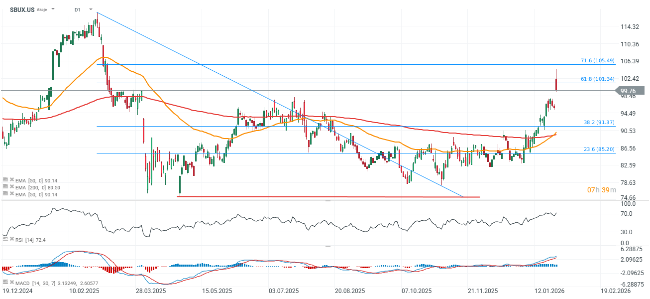 Starbucks (SBUX.US) signalizuje oživení svého podnikání v USA, i když marže zůstávají pod tlakem. Akcie rostou po zveřejnění výsledků a reakce trhu je nadějná, protože společnost konečně prolomila negativní sérii zpomalování na svém nejdůležitějším trhu – ve Spojených státech.