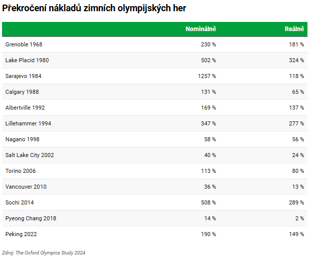 Jedním z nejlépe zdokumentovaných rysů olympijských her je systematické překračování rozpočtů. Studie Oxfordské univerzity potvrzují, že všechny olympiády bez výjimky překročily plánované náklady – u zimních her v průměru o 132 % v reálných cenách, tedy více než dvojnásobek původního rozpočtu. Tento jev není pravděpodobně způsoben jen nepředvídatelnými okolnostmi, ale spíše systematickým podhodnocováním nákladů již ve fázi kandidatury.