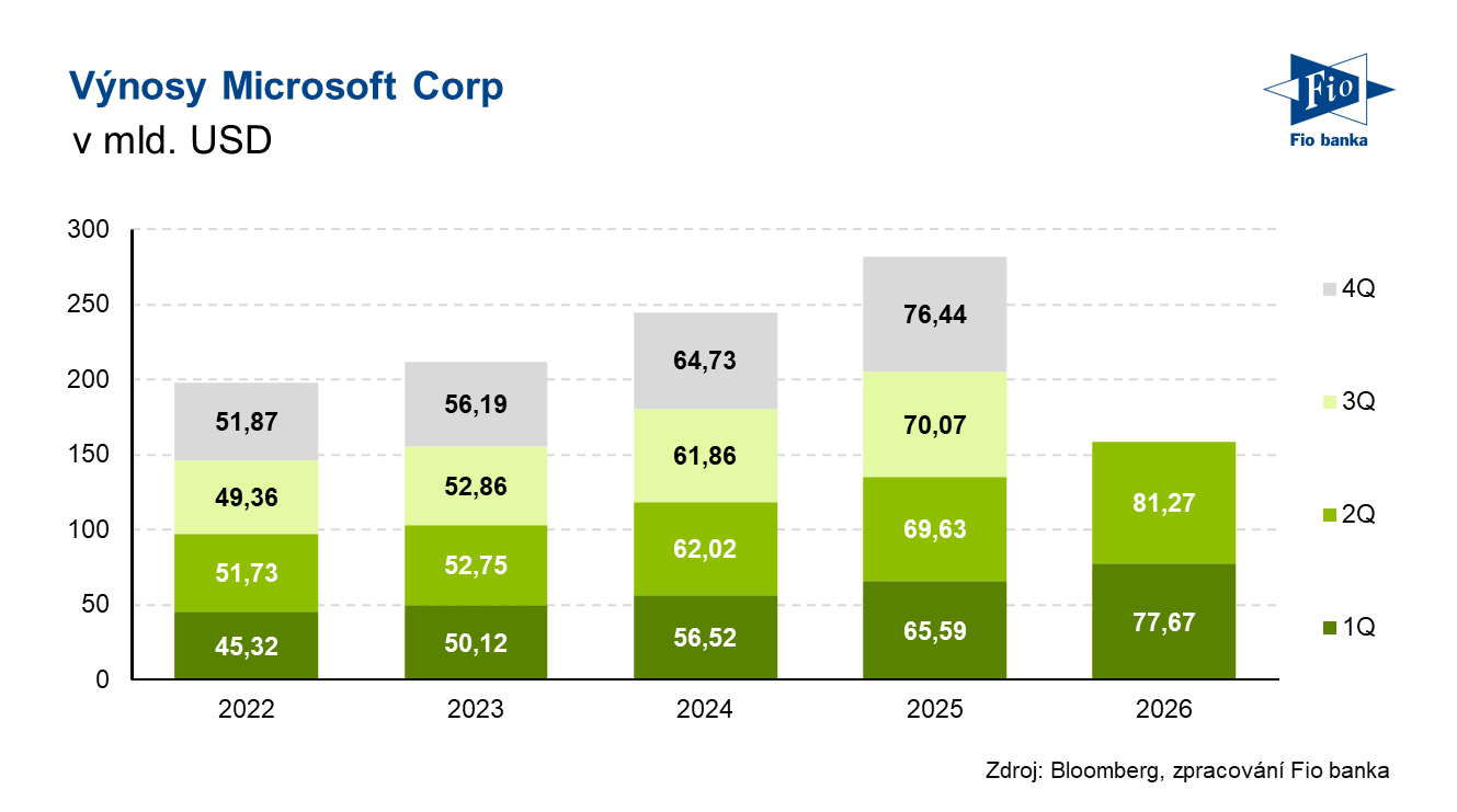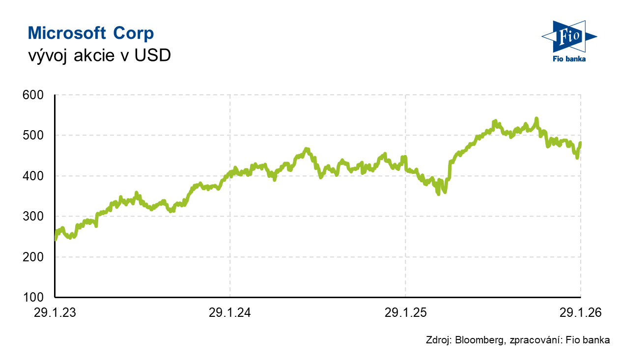 Microsoft oznámil nad očekávání dobré finanční výsledky za první fiskální čtvrtletí, kdy dosáhl zisku 3,30 USD na akcii (oček. 3,10 USD) a tržeb 65,59 miliardy USD (oček. 64,51 miliardy USD). Navzdory těmto silným číslům akcie klesly o 4 % kvůli opatrné prognóze na další období, kde společnost předpokládá růst tržeb v rozmezí 68,1 až 69,1 miliard USD, což analytiky zklamalo. Růst táhly zejména cloudové služby Azure, které meziročně vzrostly o 33 % i díky vysoké poptávce po AI produktech, kde je Microsoft významným investorem v OpenAI. -