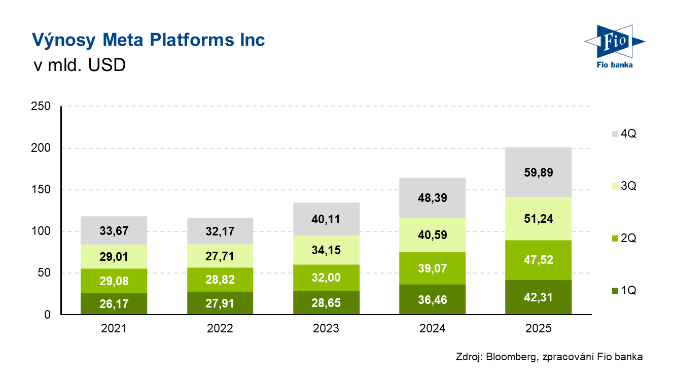Americká společnost Meta Platforms, provozovatel sociálních sítí Facebook, Instagram a dalších, zveřejnila ve středu po uzavření trhu hospodářské výsledky za čtvrté čtvrtletí roku 2025. Jak výnosy, které meziročně vzrostly o 24 % na 59,89 mld. USD, tak i očištěný zisk na akcii překonaly odhady analytiků. Nad očekáváním byl rovněž výhled pro první čtvrtletí roku 2026, který podle agentury Bloomberg pomohl vyvážit dopad vyšších kapitálových výdajů souvisejících s umělou inteligencí.
