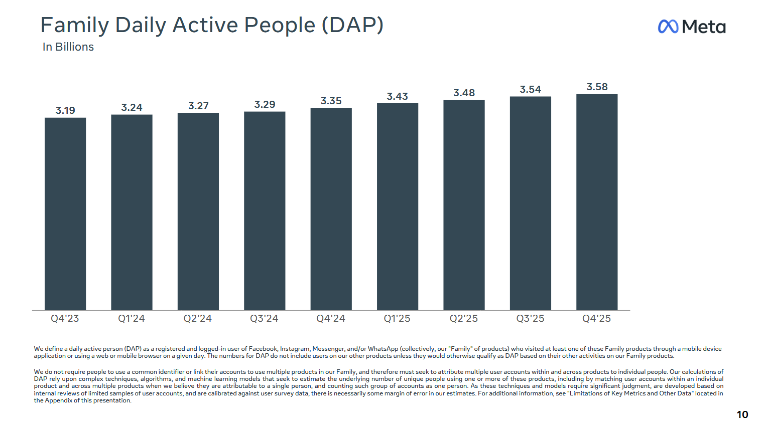 Průměrný denní počet uživatelů služeb ze skupiny Family of Apps dosáhl 3,58 mld., což představuje meziroční růst o 6,9 % a překonání očekávání nastaveného na 3,56 mld.