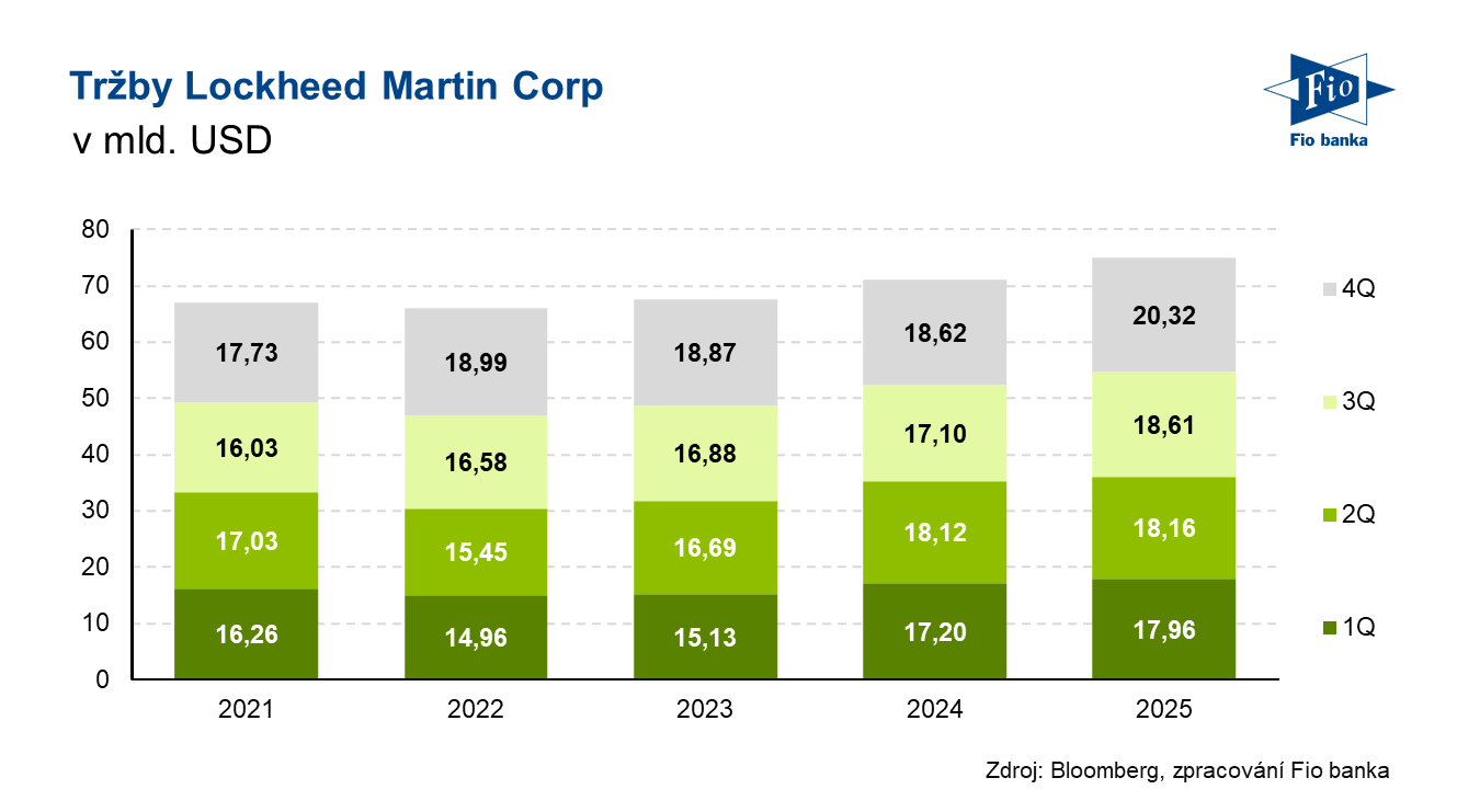 Americký výrobce raket a stíhacích letounů F-35 Lockheed Martin zveřejnil výsledky hospodaření za čtvrté čtvrtletí roku 2025. Výhled zisku na akcii pro rok 2026 byl nad očekáváním analytiků. Firma zároveň oznámila rámcovou dohodu s americkým ministerstvem obrany, která má vést ke čtyřnásobnému navýšení výroby raketového systému THAAD.