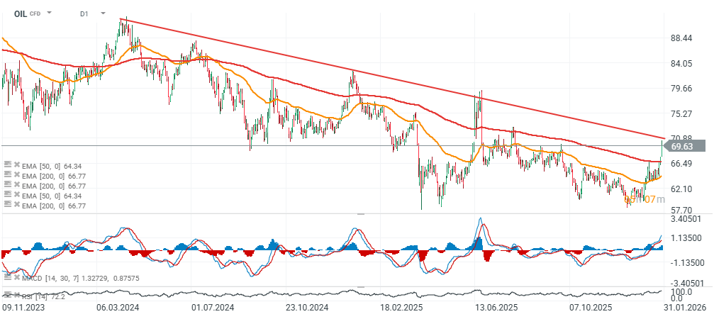 Ceny ropy Brent (OIL) dnes rostou směrem k 70 USD za barel, protože trhy započítávají rostoucí riziko možné vojenské intervence USA v Íránu. Spojené státy údajně soustředily na Blízkém východě výrazné síly – přibližně 7 % celé námořní flotily, včetně útočné skupiny letadlové lodě USS Abraham Lincoln.