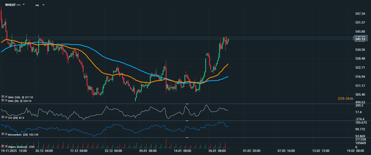 Cena pšenice dosáhla úrovně 541,13 USD, což představuje výrazný nárůst a potvrzení silného býčího trendu. Aktuální cena se nachází výrazně nad klouzavými průměry, konkrétně nad EMA 50 (525,16 USD) i SMA 100 (517,10 USD), což potvrzuje pozitivní technické nastavení a rostoucí nákupní zájem. CCI (87,3) se nachází v pásmu překoupenosti, což poukazuje na silné momentum, ale zároveň může být předzvěstí krátkodobého ochlazení růstu. Momentum (102,1) zůstává pozitivní, což podporuje pokračující růstový trend. ) Z technického pohledu se cena blíží k rezistenci kolem 545–550 USD, která může působit jako překážka v dalším postupu. Pokud dojde k průrazu nad tuto úroveň, může následovat pohyb až k 560 USD. Naopak v případě korekce by první důležitou podporou mohla být oblast okolo EMA 50 (525 USD), která se nedávno stala odrazovým bodem pro poslední růst.