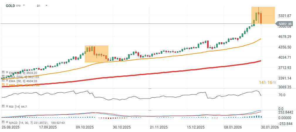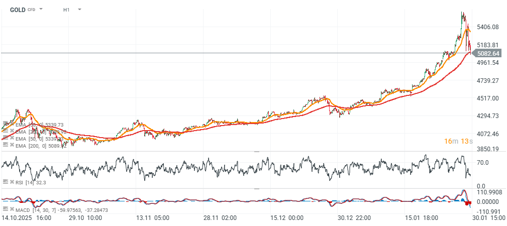 Tento pokles přichází navzdory tomu, že velké banky jako JPMorgan a UBS zvýšily své výhledy, což naznačuje, že krátkodobé momentum se obrátilo proti drahým kovům. RSI u zlata včera propadl z hodnot kolem 89 na méně než 28 – během jednoho z největších výprodejů drahých kovů v moderní historii.