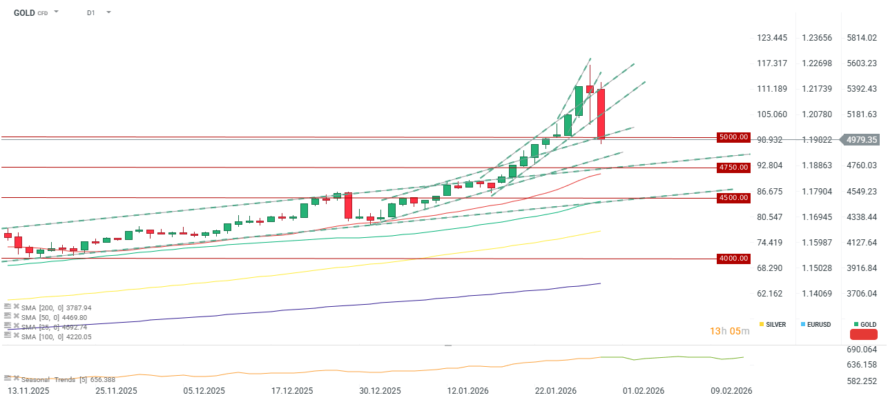Zlato dnes kleslo pod hranici 5 000 USD. Tento 7% pokles představuje volatilitu, která je v této třídě aktiv výjimečná. Další klíčové úrovně podpory se nacházejí na 4 750 a 4 500 USD.