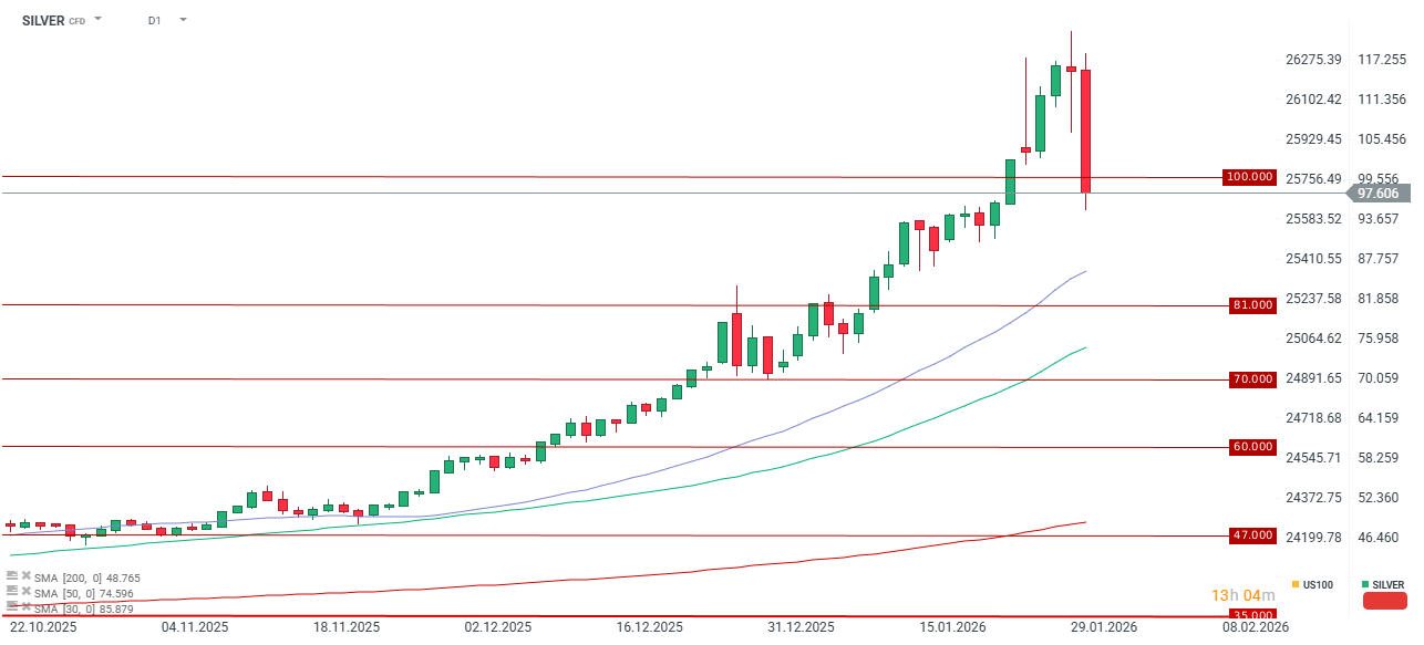 Stříbro ustoupilo až o 15 %, propadlo se pod hranici 100 USD za unci. Další významné úrovně podpory se nacházejí v pásmu 80–90 USD za unci.