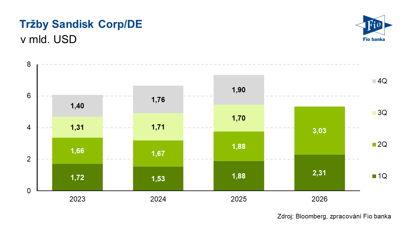 Klíčová slova: Analytik | Akcie | Bloomberg | CEO | Dividendový výnos | Marže | P/E | Rally | Ukazatel | Výnos | Zisk na akcii | USD | Obchodování | Morgan Stanley | Zisk | Výsledky | EPS | Banka | Fio banka | Cena | Fio | Reuters | Vývoj akcií | Cílová cena | Hrubá marže | Tržby | Raymond James | Cantor Fitzgerald | Růst akcií | Zajištění | Kapitalizace | Výhled | Konsensus | Očekávání | Akcie společnosti | Edge | Čistý zisk | Generální ředitel | Ziskovost | Hospodaření | Výsledky hospodaření | Analytička | Provozní zisk | Meziroční růst | Vývoj | Tržby společnosti | Další růst | Růst | Umělé inteligence | Prostor pro další růst | Růst tržeb | Ceny | Výrazný růst | Prodejní ceny | Tržní prostředí | Americký výrobce | AI | Odvětví | Společnosti | Společnost | Výsledky společnosti | 3М | Western Digital | Přijetí | Strukturální změny | Kioxia | Očištěný zisk na akcii | Výkon | Služby | Fio banka, a.s. | Michal Bárta | SanDisk | Akcie SanDisk | SNDK | SanDisk (SNDK) | Akcie společnosti SanDisk |