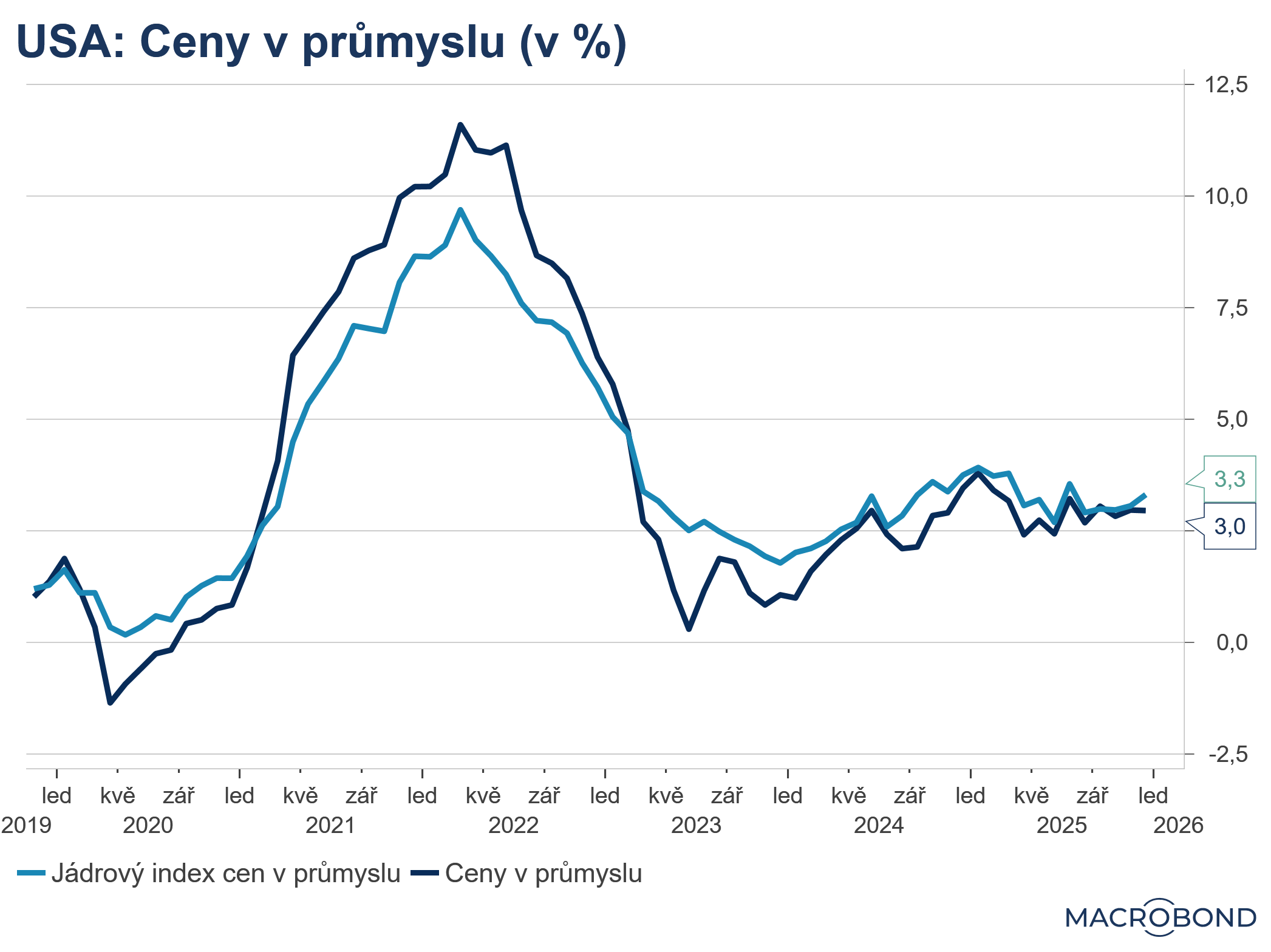 Index cen v průmyslu v lednu vzrostl o 6 % meziročně, přičemž trhy očekávaly růst o 5,4 % meziročně. Rovněž jádrový index výrobních cen vzrostl více, než očekával trh (4,9 %) a to o 5,4 % meziročně. -