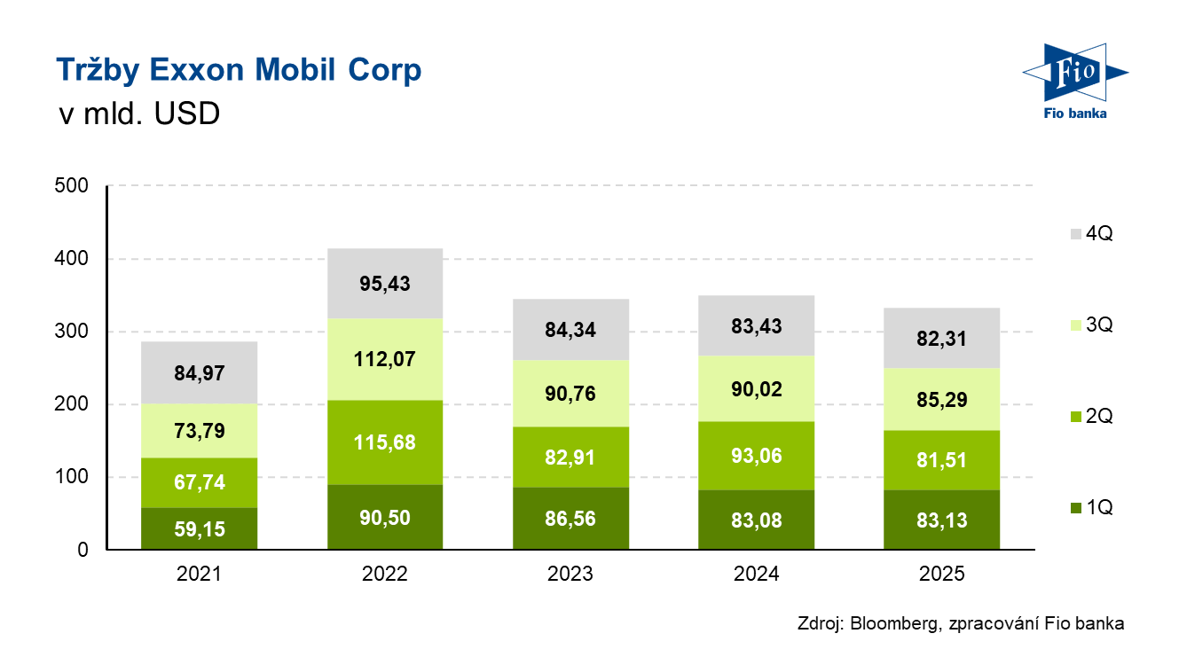 Ropný gigant Exxon Mobil reportoval výsledky hospodaření za 3. čtvrtletí roku 2025. Společnost za dané období vykázala tržby a ostatní příjmy ve výši 85,29 mld. USD, tedy nad průměrným odhadem analytiků 83,60 mld. USD. Zároveň oznámila zvýšení čtvrtletní dividendy o 4 % na 1,03 USD na akcii. -