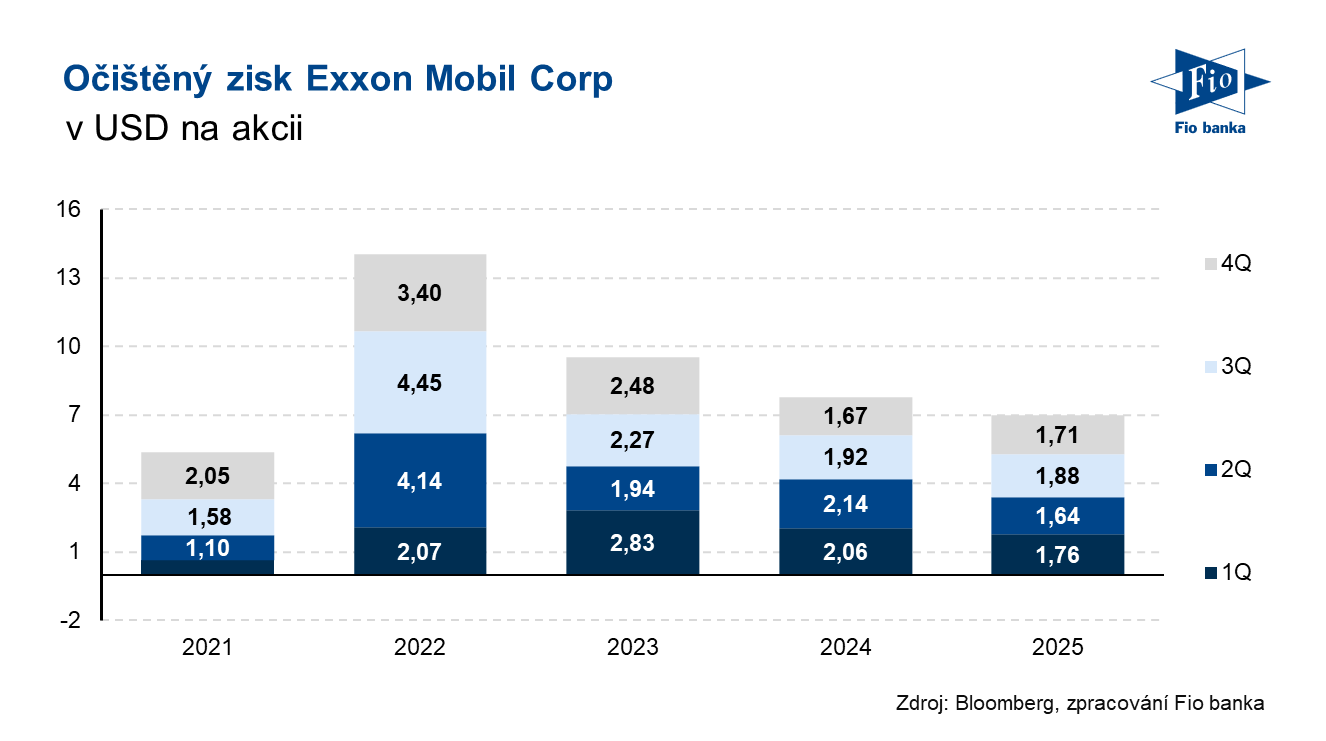 Ropný gigant Exxon Mobil zveřejnil výsledky hospodaření za čtvrté čtvrtletí roku 2025. Zisk na akcii za sledované období dosáhl 1,71 USD, což bylo zhruba v souladu s konsenzem analytiků ve výši 1,69 USD.