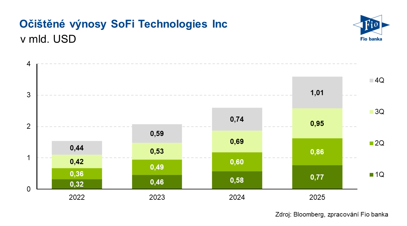 Americká společnost SoFi Technologies, která se zabývá osobními financemi a finančními technologiemi, zveřejnila své výsledky za čtvrtý kvartál roku 2025. Společnost zaznamenala meziroční růst očištěných výnosů o 37 % a zveřejnila svůj celoroční a střednědobý výhled. Vedení společnosti očekává, že počet členů v celém roce 2026 vzroste o alespoň 30 %.